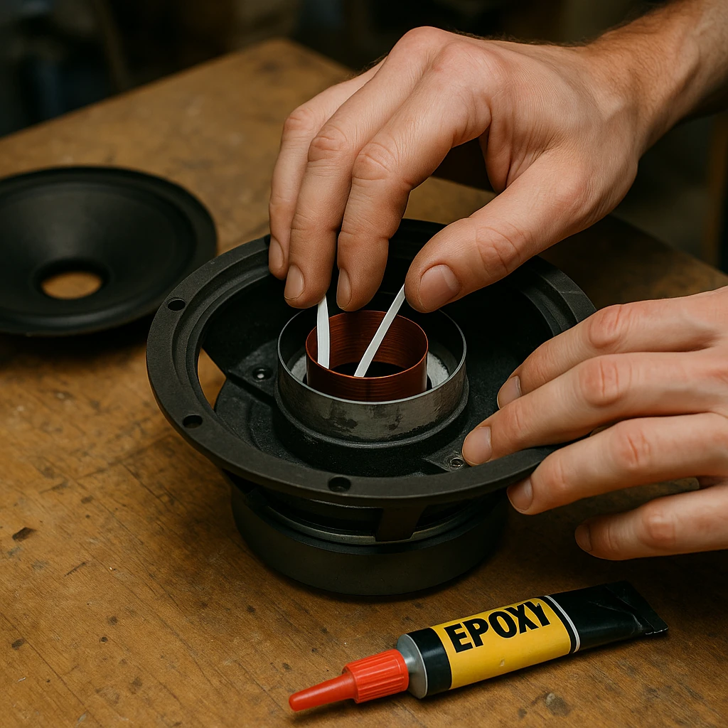 پس از خشک شدن کامل چسب اسپایدر، سوراند جدید را روی لبه بیرونی دیافراگم و لبه سبد بچسبانید. استفاده از روشهای مناسب برای تثبیت مرکزیت در این مرحله ضروری است (معمولاً با قرار دادن چند تکه کاغذ نازک زیر کویل و سپس چسباندن سوراند).