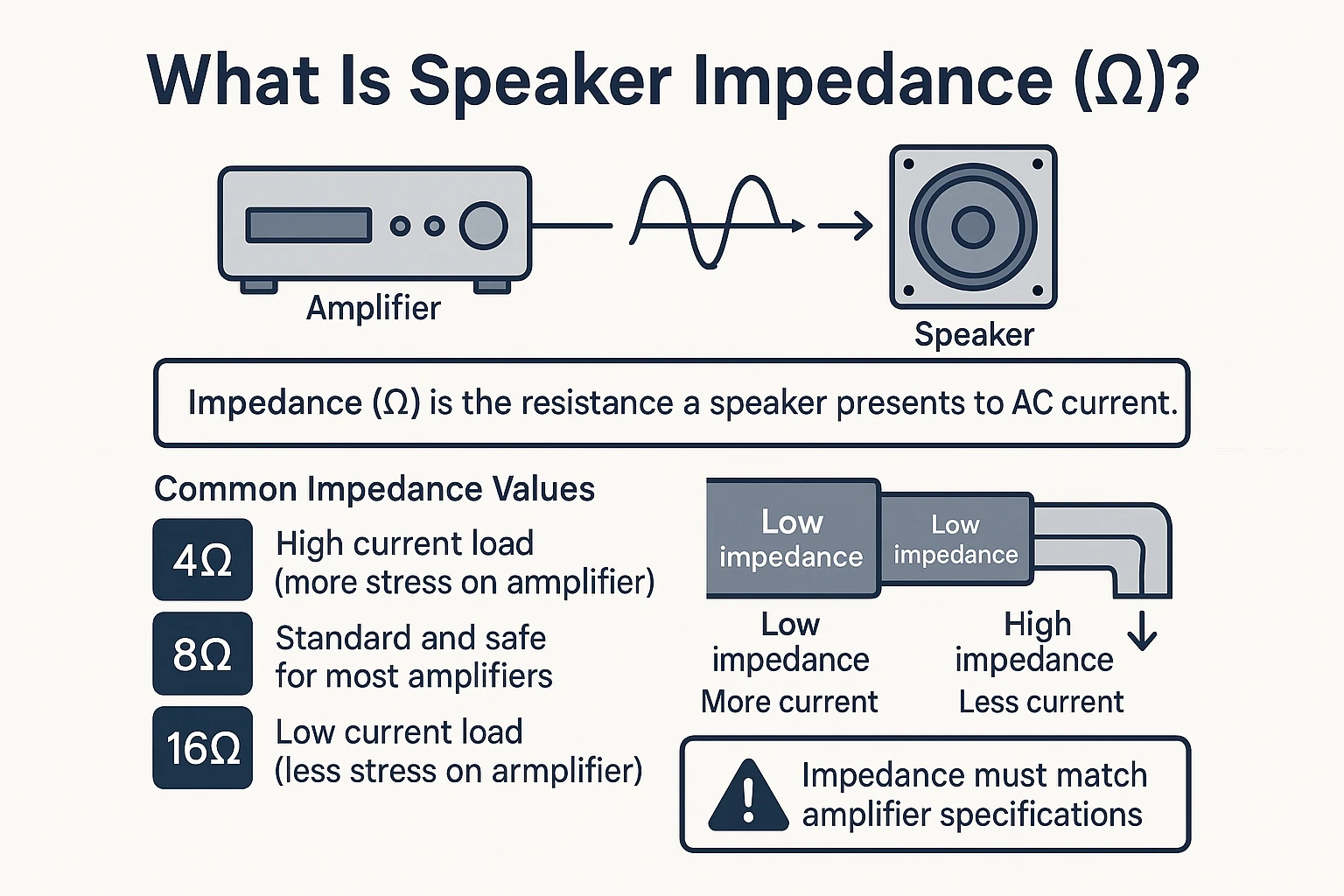 هر آمپلیفایر برای عملکرد صحیح و ایمن، باید با امپدانس مشخصی کار کند؛ برای مثال 4 اهم، 8 اهم یا 16 اهم. اگر امپدانس بلندگو با توان و محدودهی مجاز آمپلیفایر هماهنگ نباشد، ممکن است کیفیت صدا کاهش پیدا کند یا به آمپلیفایر آسیب وارد شود.