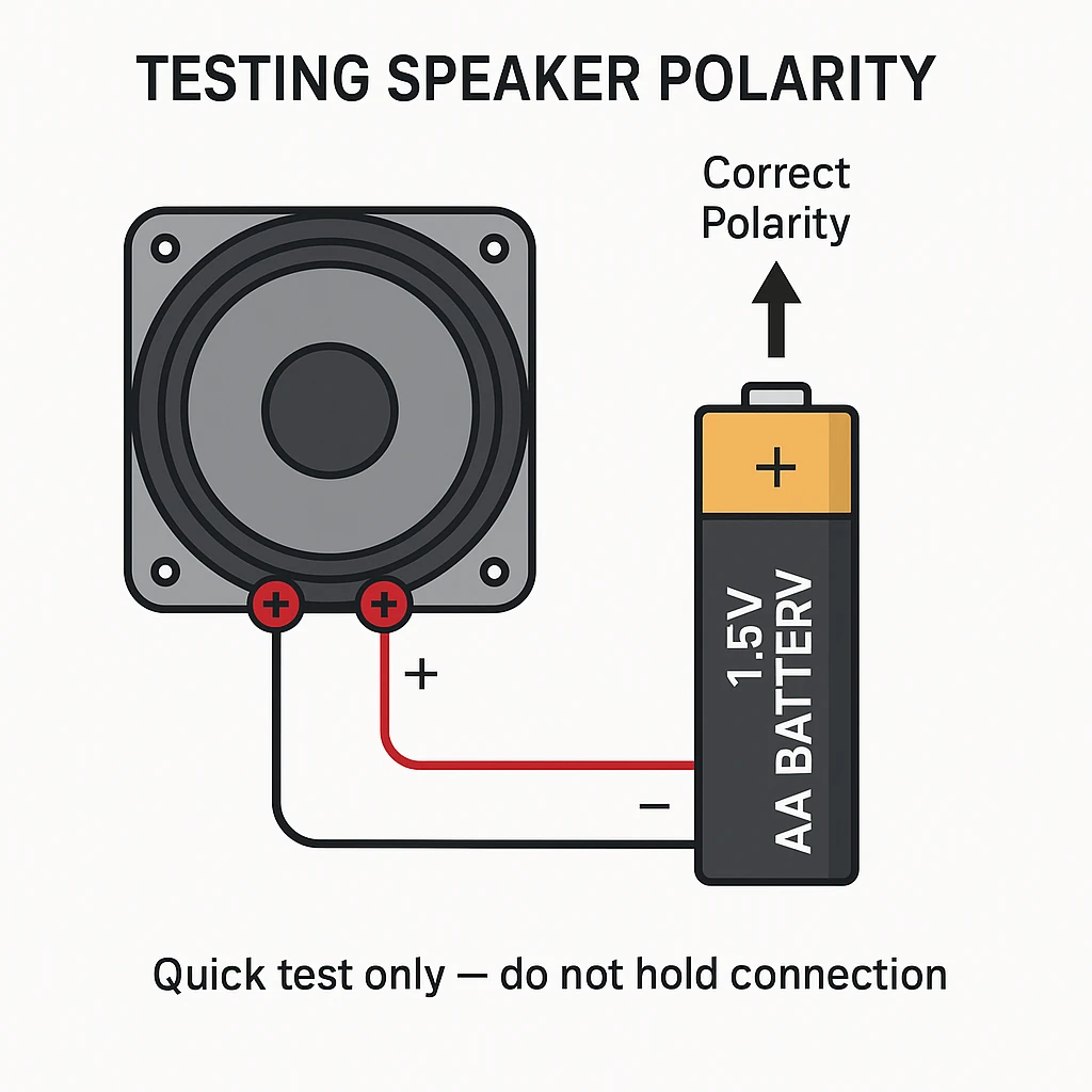 پاسخ: سادهترین راه، استفاده از یک باتری 1.5 ولت (AA یا AAA) است. با اتصال سریع ترمینال مثبت باتری به ترمینال مثبت بلندگو و ترمینال منفی باتری به ترمینال منفی بلندگو، دیافراگم بلندگو باید به سمت بیرون حرکت کند. اگر دیافراگم به سمت داخل حرکت کرد، قطبیت معکوس است. (توجه: این کار فقط باید برای آزمایش سریع انجام شود و نباید برای مدت طولانی اعمال شود.)