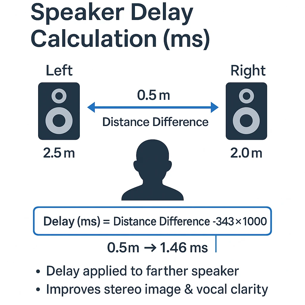 برای اینکه صدای دو بلندگو همزمان به گوش شنونده برسد، باید اختلاف فاصله آنها تا شنونده را جبران کنیم. این جبران با استفاده از تأخیر زمانی (Delay) انجام میشود.